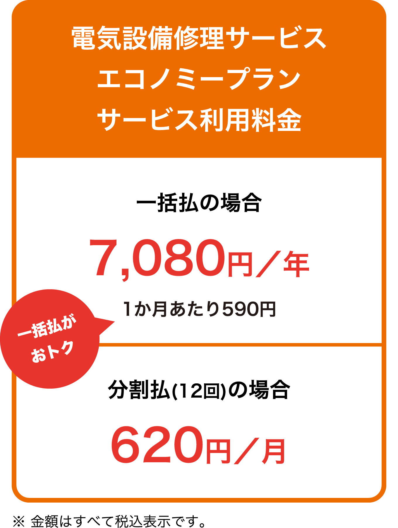 - 電気設備修理サービス エコノミープランの一括払7,080円を12か月で割った1か月あたりの金額。
